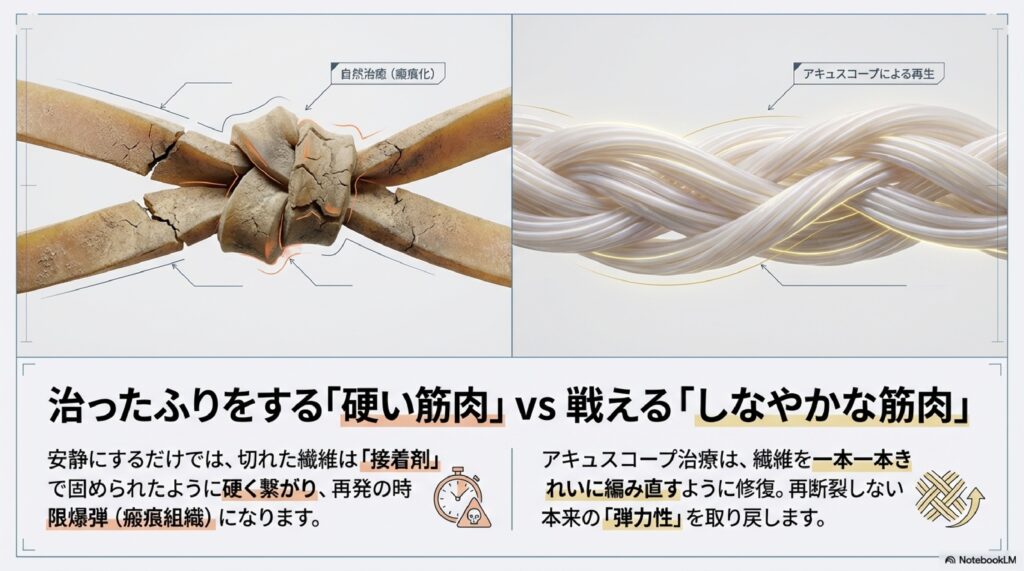 なぜなら、人間の体は放っておくと、筋肉を元通りに治すのではなく、「とりあえずの代用品(瘢痕組織)」で傷口を塞いでしまうからです。