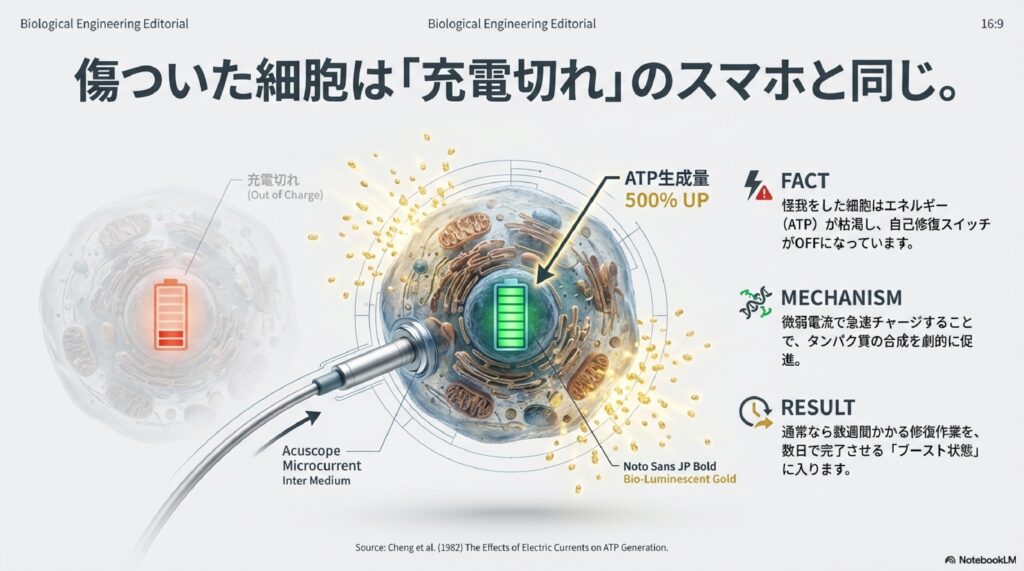 アキュスコープは、患部の微弱な電気信号を読み取り、その細胞が最も欲しがっている電気を流し込むことで、ATPの生産量を劇的に引き上げます。