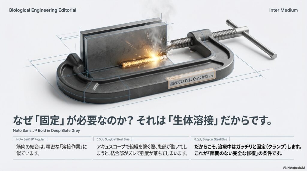 だからこそ、当院では初期の「固定」に徹底的にこだわります。 アキュスコープによって細胞が爆発的に再生しているその瞬間、筋肉を「最もくっつきやすい理想的な位置」で固定する。この「科学的な電気」×「伝統的な固定技術」の組み合わせこそが、しなやかで強靭な筋肉を復活させる唯一の道なのです。