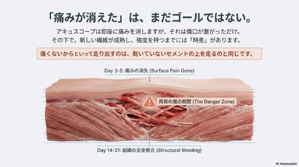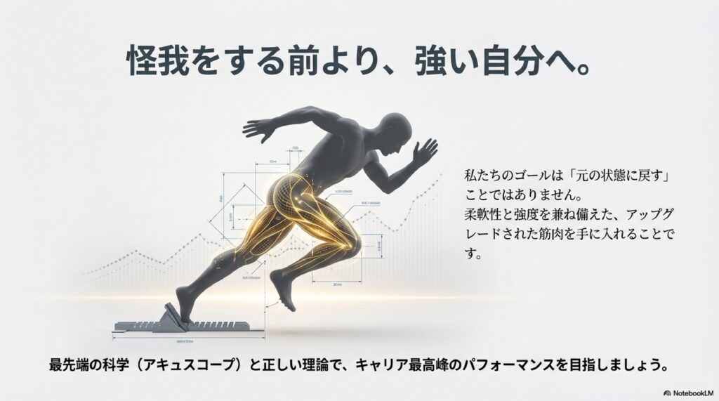 第2部では、肉離れの治療において最も重要な「組織の質」について、そして最新科学「アキュスコープ」がいかにして筋肉を細胞レベルで作り変えるのか、その秘密を明かします。
