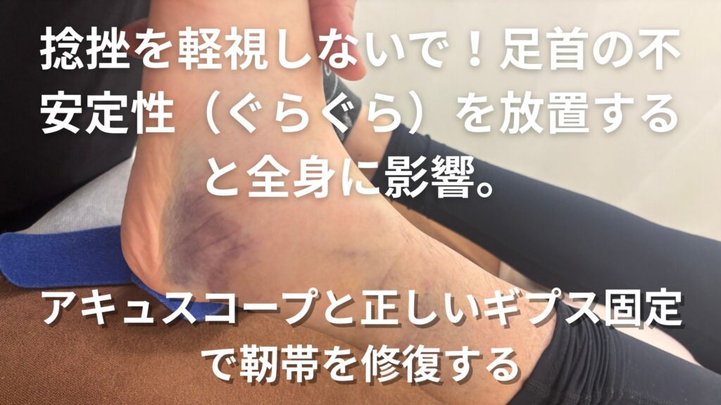 捻挫を軽視しないで!足首の不安定性(ぐらぐら)を放置すると全身に影響。アキュスコープと正しいギプス固定で靭帯を修復する